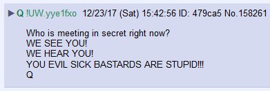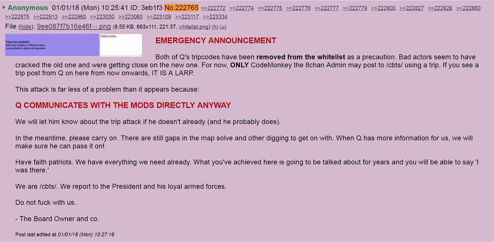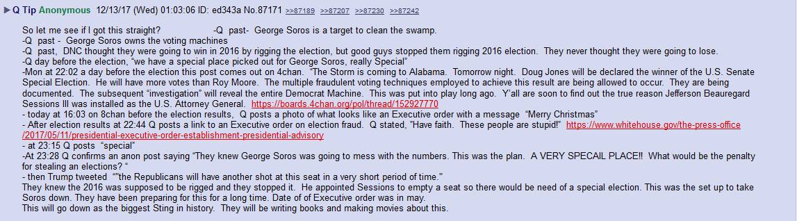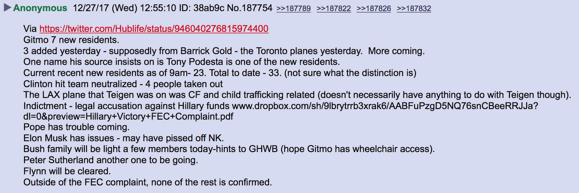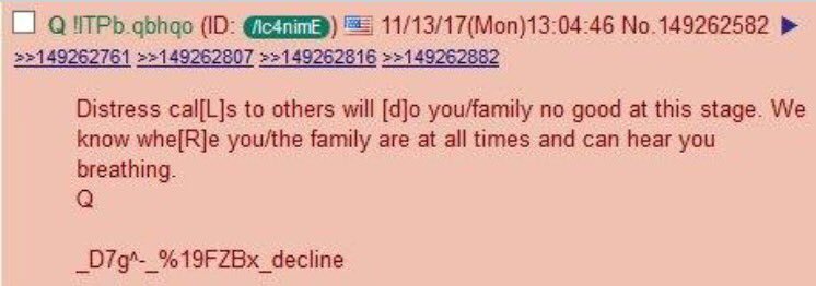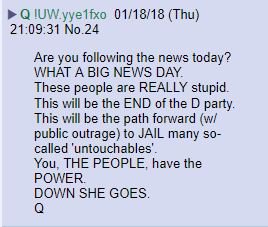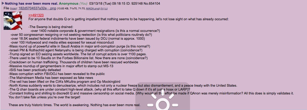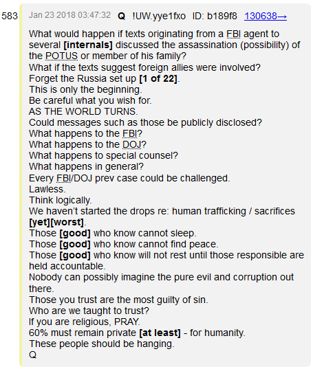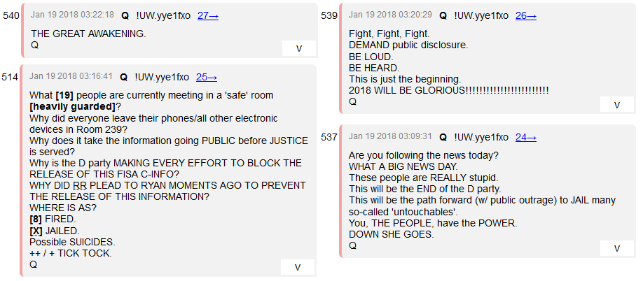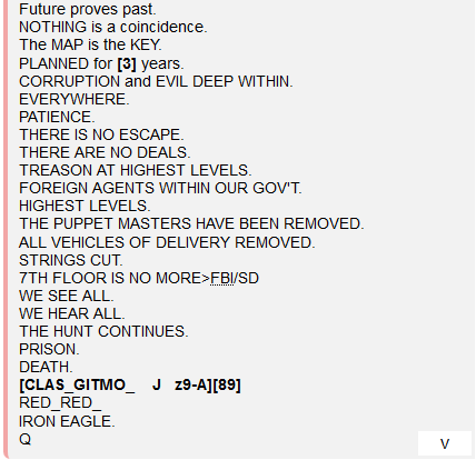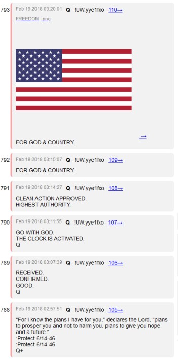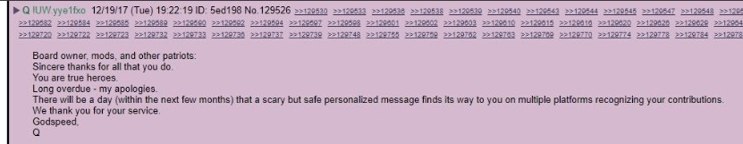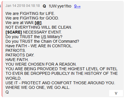 nennt. Er postet seine Nachrichten auf dem Info-Board 8chan. Übersichtlicher ist es jedoch hier. Seine Fangemeinde wächst exponentiell – weltweit. Qanon vereint weltweit die patriotisch gesinnte Wahrheitsbewegung, indem er den Maskenfall des kriminellen Establishments anleitet. Es ist, wie wenn jemand in einem dunklen, modrigen Keller das Licht anmacht. Am 22. Januar 2018 (in Nachricht Nr. 586) sagte Q:
